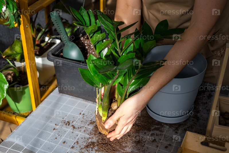 Пересадка разросшегося домашнего растения суккулентного замиокулькаса с комком корней и луковицы в новый горшок большего размера. Уход за растением в горшке, руки женщины в фартуке, макет