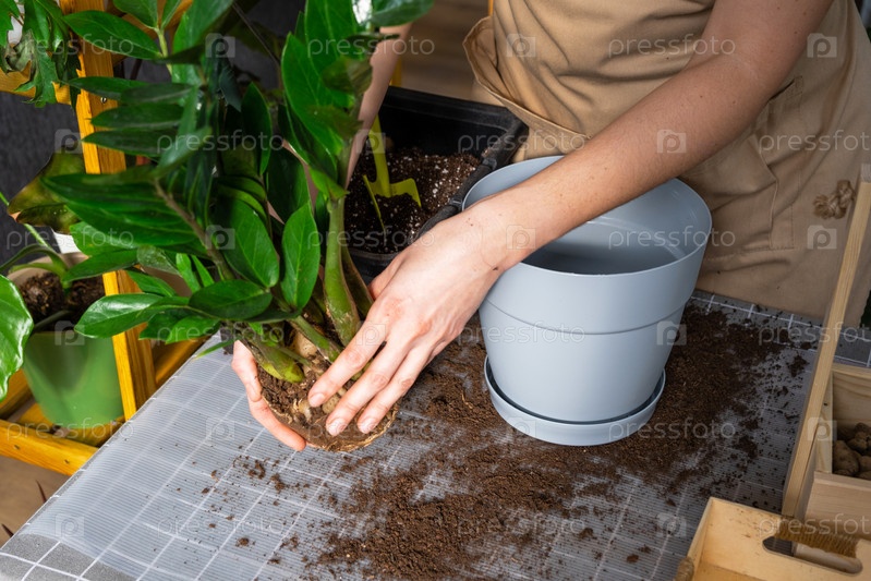 Пересадка разросшегося домашнего растения суккулентного замиокулькаса с комком корней и луковицы в новый горшок большего размера. Уход за растением в горшке, руки женщины в фартуке, макет