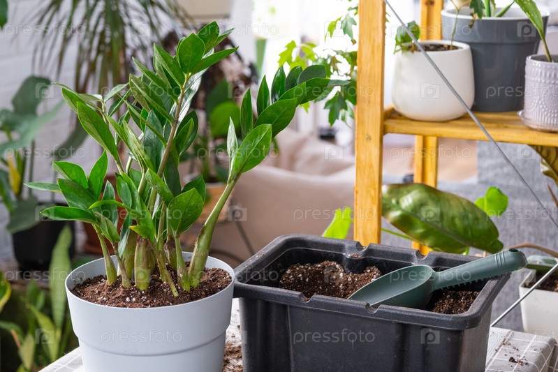 Пересадка домашнего растения суккулентного замиокулькаса в новый горшок. Уход за горшечным растением, раскладка на столе с почвой, лопатой, декоративным цветочным горшком