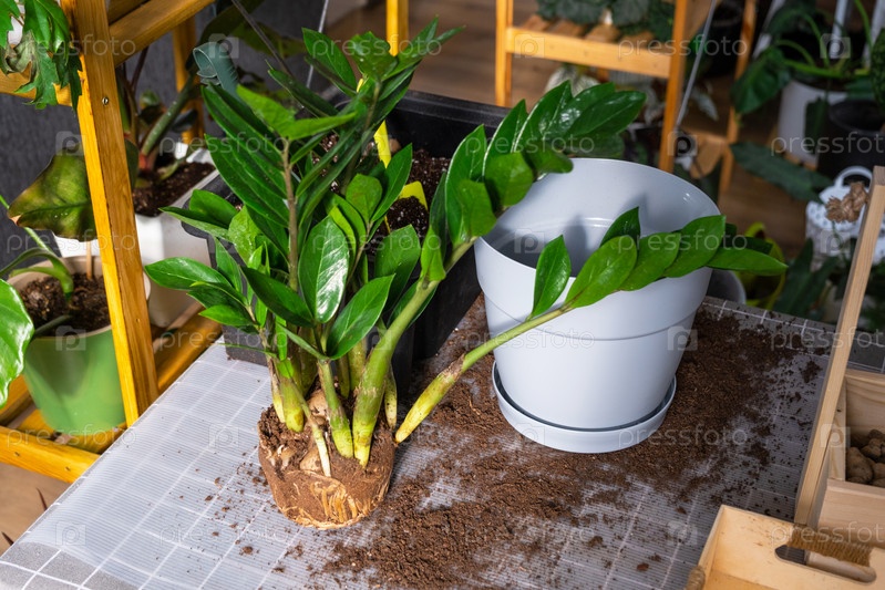 Пересадка домашнего растения суккулентного замиокулькаса в новый горшок. Уход за горшечным растением, раскладка на столе с почвой, лопатой, декоративным цветочным горшком