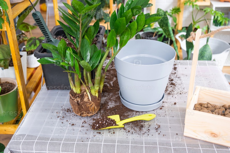 Пересадка домашнего растения суккулентного замиокулькаса в новый горшок. Уход за горшечным растением, раскладка на столе с почвой, лопатой, декоративным цветочным горшком