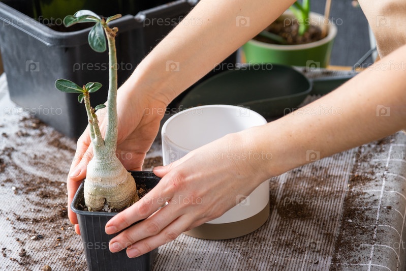 Пересадка домашнего растения суккулентного адениума в новый горшок. Уход за растением в горшке, раскладка на столе с почвой, лопатой, руками женщины в фартуке