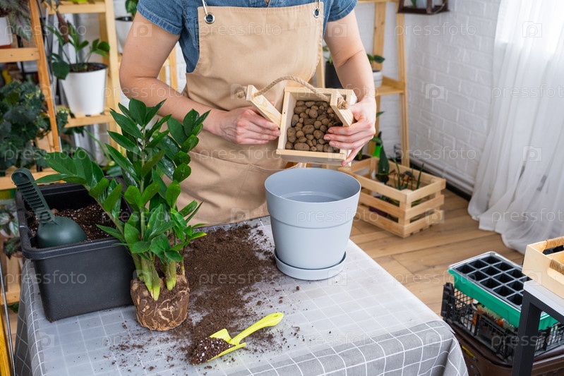 Пересадка разросшегося домашнего растения сочного замиокулькаса с комком корней и луковицы в новый горшок большего размера. Уход за растением в горшке, руки женщины льют дренаж в фартук, макет