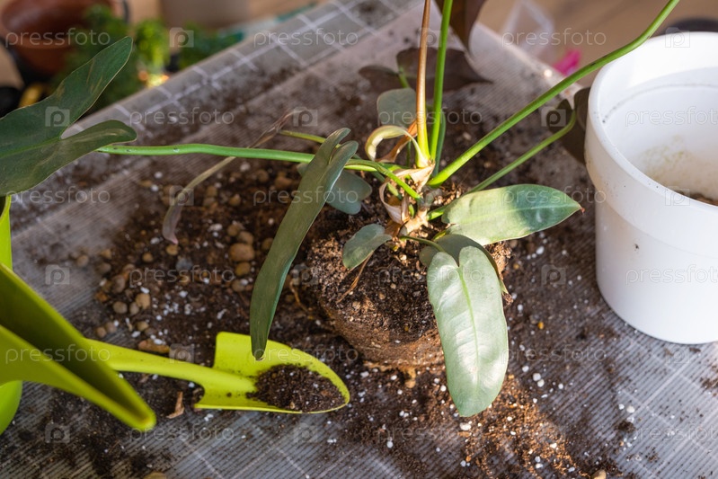 Пересадка домашнего растения Philodendron Santa Leopoldina в новый горшок в интерьере дома.Уход за горшечным растением земляной ком с корнями