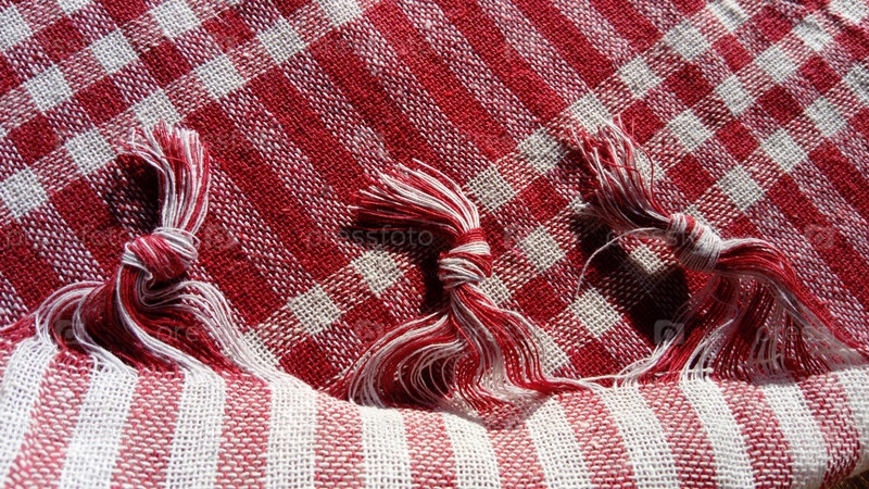 Клетчатая кухонная ткань с переплетением красных и белых нитей лежит на столе и имеет три кисточки по краю полотна