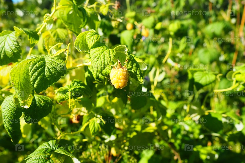 Желтая малина. Выращивание органических ягод крупным планом. спелая малина в фруктовом саду. Крупноплодный ремонтантный сорт с яркими золотисто-желтыми плодами. Плотные транспортабельные ягоды