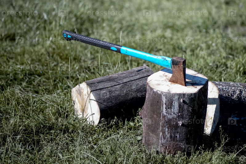 Ржавый топор для рубки дерева застрял в пне