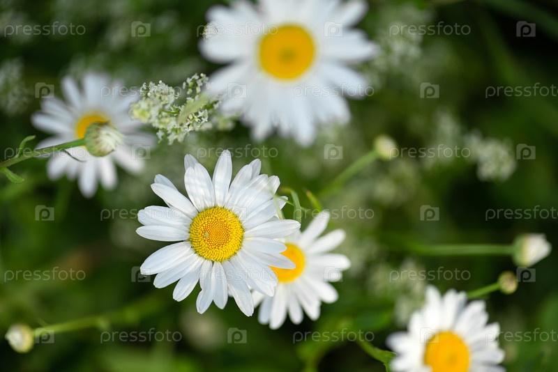 Крупным планом цветущие белые полевые цветы ромашки в поле летом
