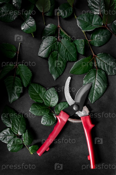 Садовый секатор среди срезанных листьев роз на черном фоне. Домашнее садоводство