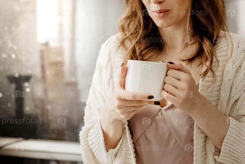 Крупный план молодой привлекательной женщины, держащей чашку горячего кофе