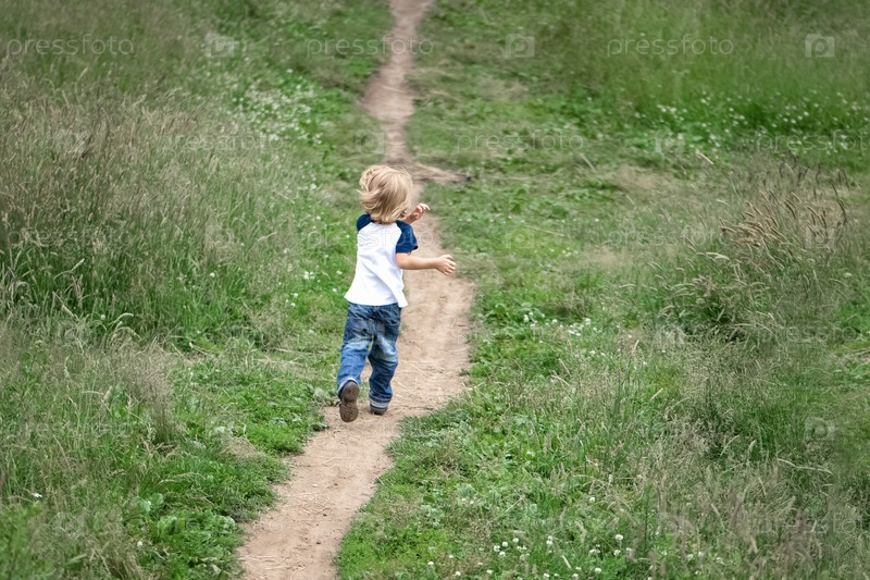 Маленький мальчик убегает по тропинке на летнем зеленом лугу