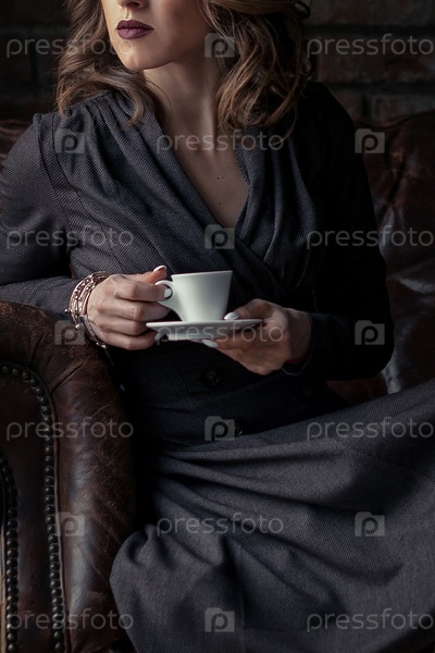 Элегантная женщина сидит в кафе с чашкой кофе в руках