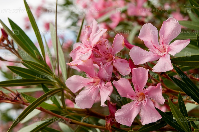 Розовые тропические цветы среди зеленых листьев