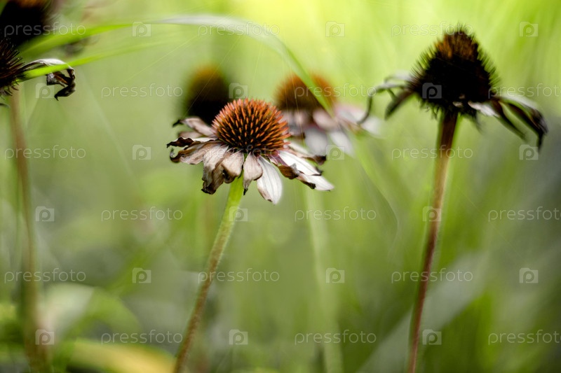 Сушеные розовые цветы эхинацеи в саду. Естественный размытый фон. Осенняя тема