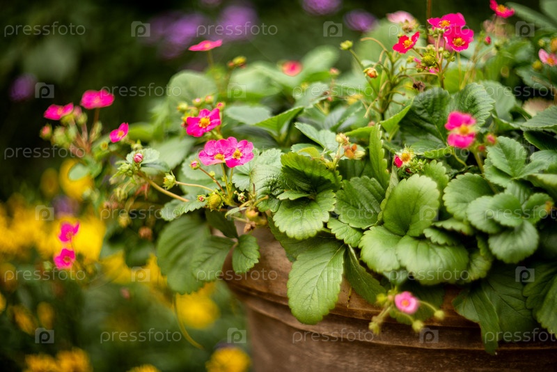 Горшечные растения клубники цветут ярко-розовыми цветами
