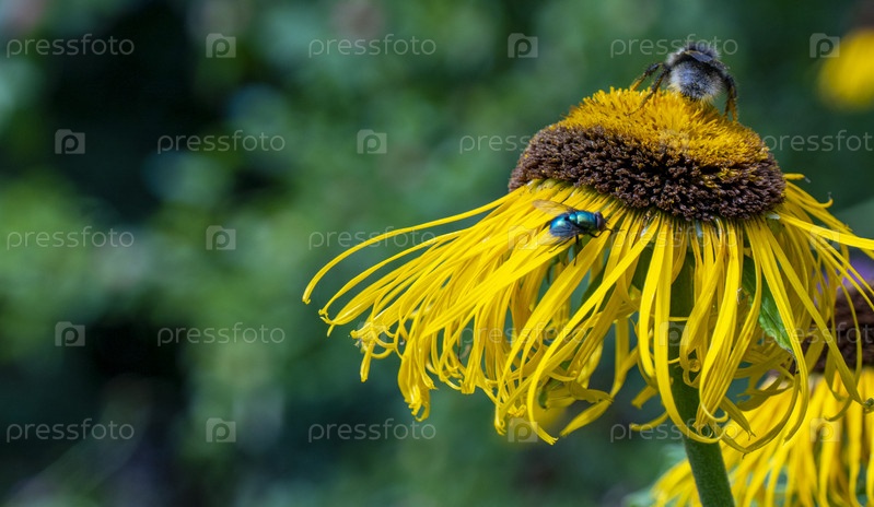 Пчела и муха собирает нектар с красивого цветка