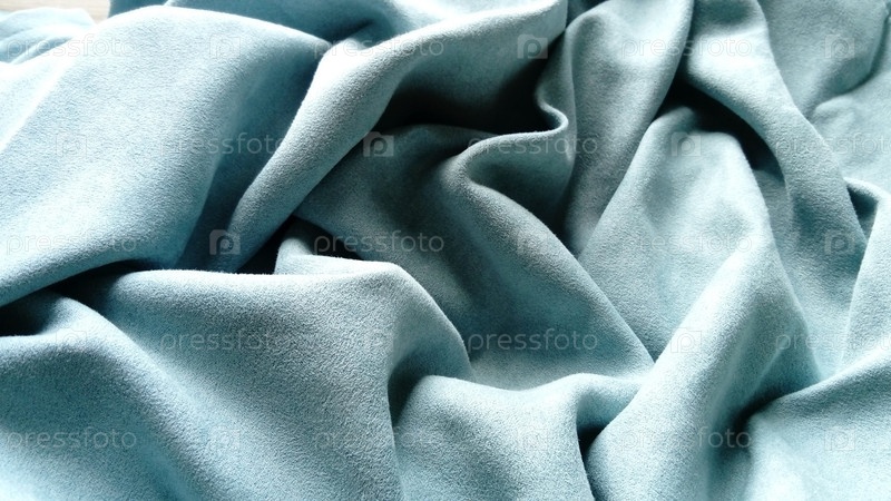 Бархатистая плотная ткань для штор серо-голубого цвета, хаотично сложенная красивыми плавными волнами с игрой света и тени. Естественный дневной свет