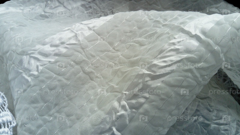 Прозрачная синтетическая ткань белого цвета с блестящими белыми полосками. Бесцветный тюль для комнаты. Легкие мятые портьеры с летящей толстой полосой, люрексом и тесьмой ришелье. Небрежно уложенная ткань