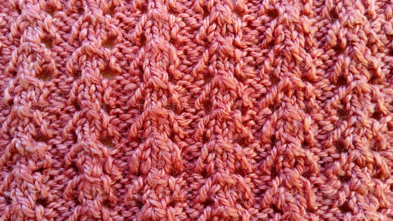 Вязание синтетическими или шерстяными нитками. Вязаное теплое зимнее изделие - шапка, свитер, варежка. Крупный план красной пряжи. Традиционный вязаный узор крючком из ниток, образующих красивые ровные отверстия