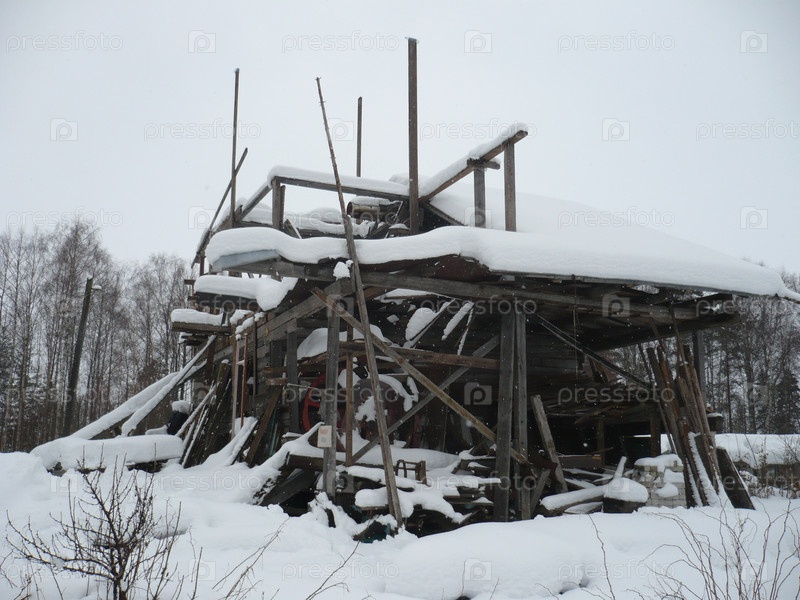 Недостроенный дом или дача завалены снегом. Леса. Незавершенная конструкция. Построить сельский дом своими руками из подручных материалов. Старые доски торчат из-под снега
