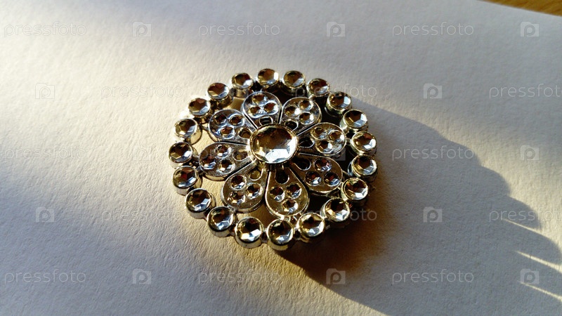 Украшение - брошь при слабом солнечном свете на белом фоне. Металлический или блестящий пластиковый предмет для украшения одежды. Маленькие стеклянные камешки располагаются по кругу вокруг предмета. Украшения блестят на солнце
