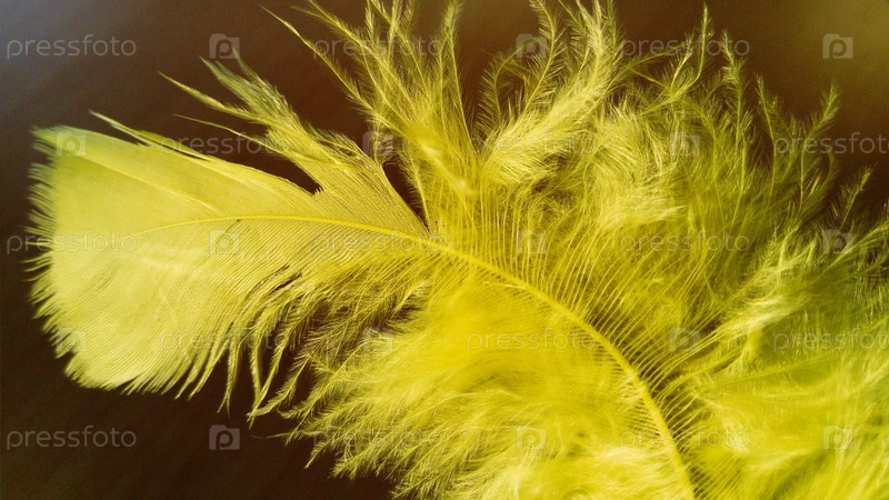 Желтое пушистое перо на темном фоне. Крупный план