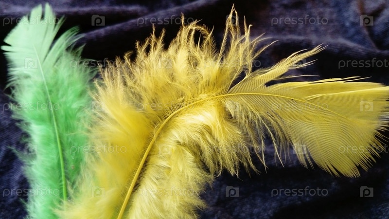 Два нежных пушистых пера на темном фоне. Одно перо ярко-желтое, второе перо на заднем плане зеленое. Декоративные перья для украшения одежды, головных уборов, праздничных масок