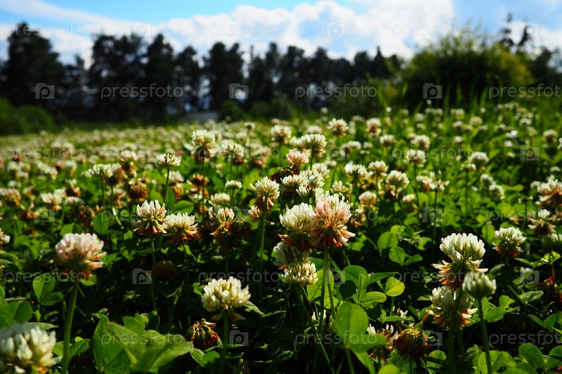 Trifolium repens, белый клевер, травянистое многолетнее растение семейства бобовых Fabaceae, известное как Leguminosae. Травянистое многолетнее растение. Он низкорослый с головами белых цветов. Карелия