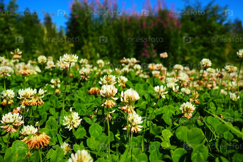 Trifolium repens, белый клевер, травянистое многолетнее растение семейства бобовых Fabaceae, известное как Leguminosae. Травянистое многолетнее растение. Он низкорослый с головами белых цветов. Карелия