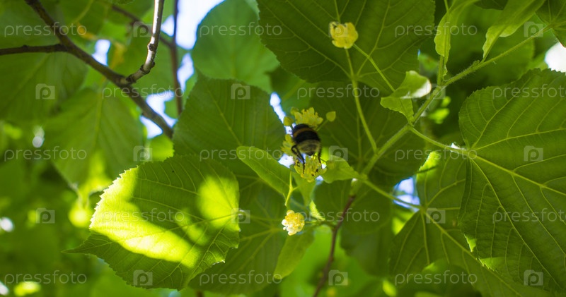 Липа, липа, липа или липа с нераспустившимся цветком. Дерево липа собирается цвести. Пчела собирает липовый мед