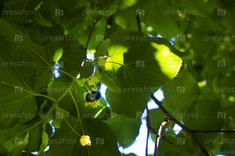 Липа, липа, липа или липа с нераспустившимся цветком. Дерево липа собирается цвести. Пчела собирает липовый мед