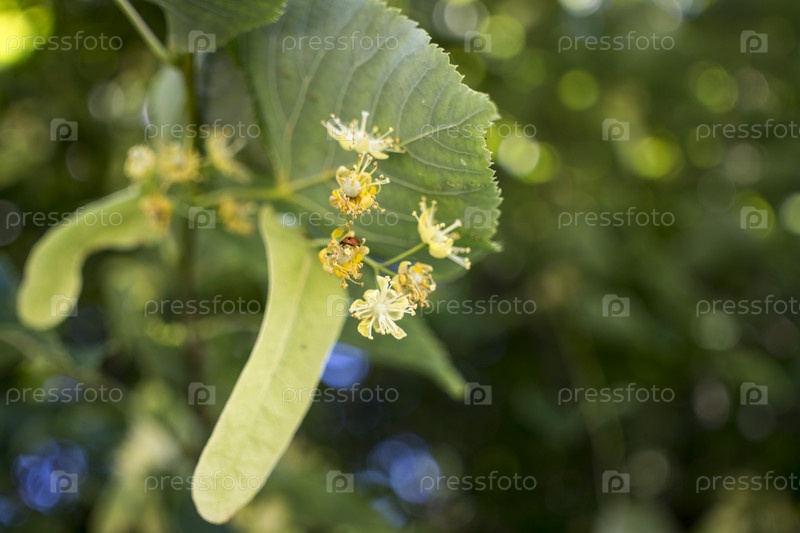 Липа, липа, липа или липа с нераспустившимся цветком. Дерево липа собирается цвести. Пчела собирает липовый мед