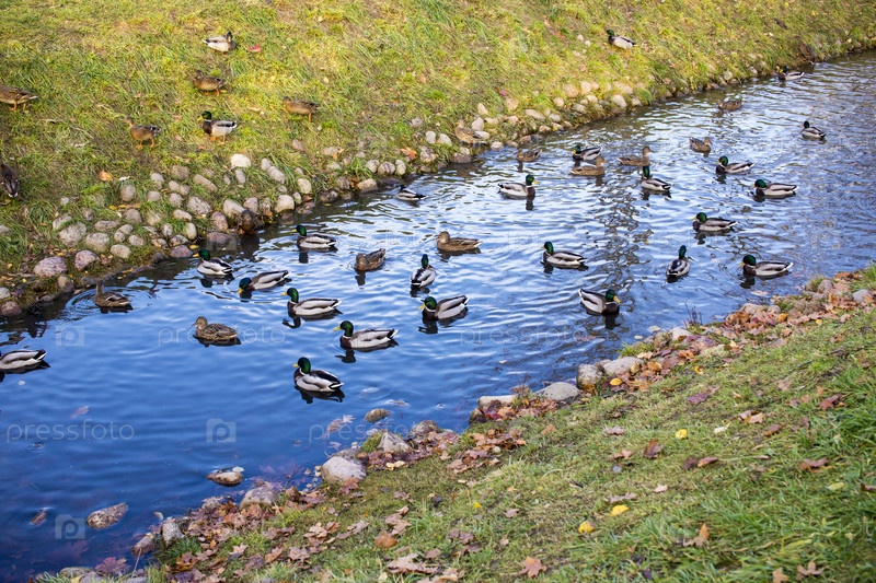 Осенний пейзаж со стаей крякв, плывущих по озеру