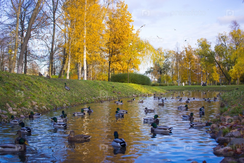 Осенний пейзаж со стаей крякв, плывущих по озеру