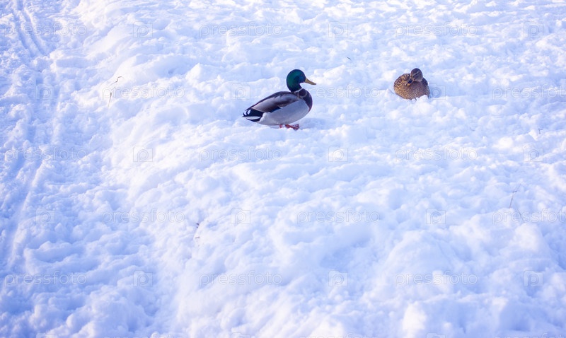 Утиная пара на зиму. концепция крыльев любви. Скопируйте пространство