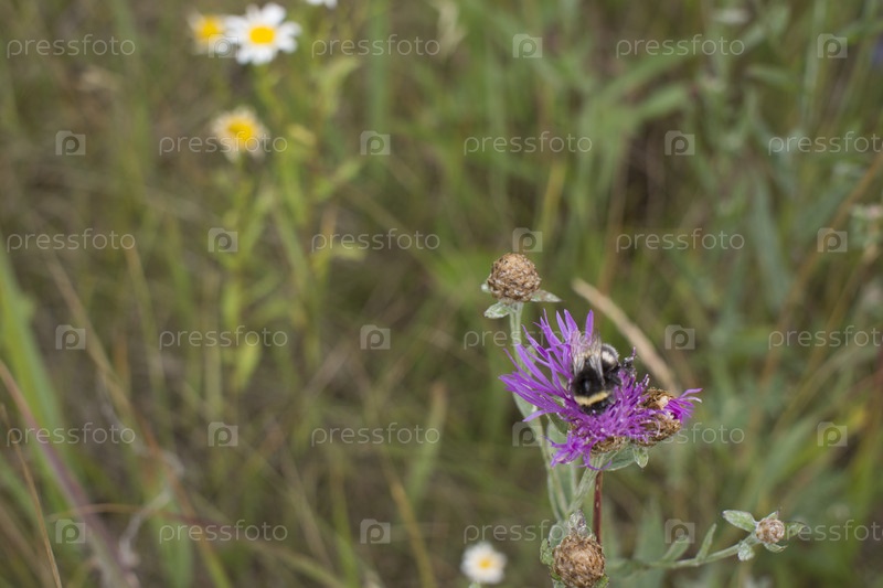 Шмель на чертополохе на размытом зеленом фоне с копией пространства