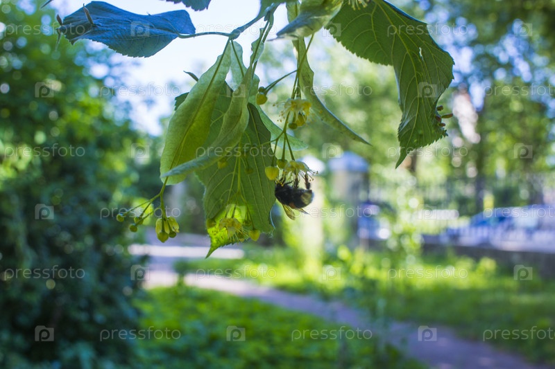 Липа, липа, липа или липа с нераспустившимся цветком. Дерево липа собирается цвести. Пчела собирает липовый мед