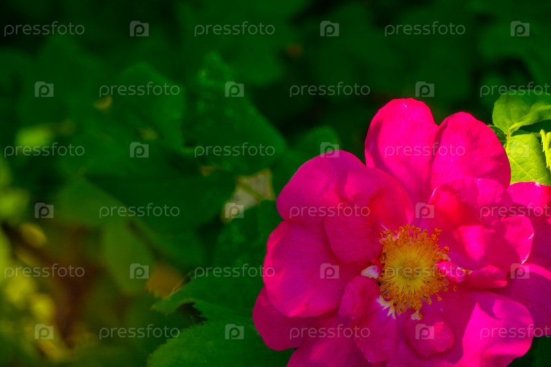 Красивый темно-розовый цветок шиповника крупным планом. Цветущий куст шиповника лекарственного. Свободное место