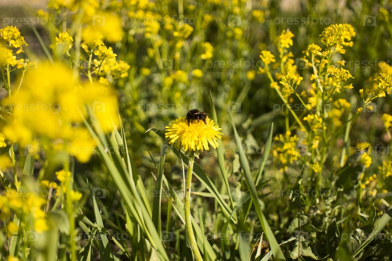 Шмель собирает пыльцу в желтом цветке одуванчика на рассеянном фоне зеленой травы