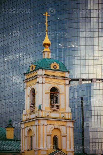 церковь на фоне офисного здания