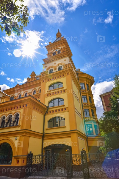 Теремок на фоне голубого неба в Москве, желтый дом в лучах яркого солнца