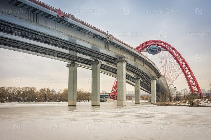 Вид снизу на автомобильный мост с красной аркой, живописный мост через Москву-реку, живописный мост с летающей тарелкой