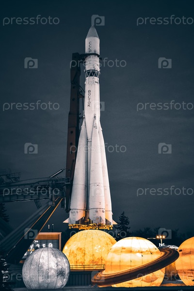 Ракета Восток в парке рядом с выставкой планет в серых тонах