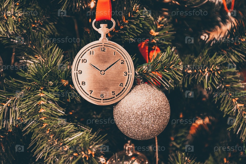 Игрушка в виде часов на ветке елки