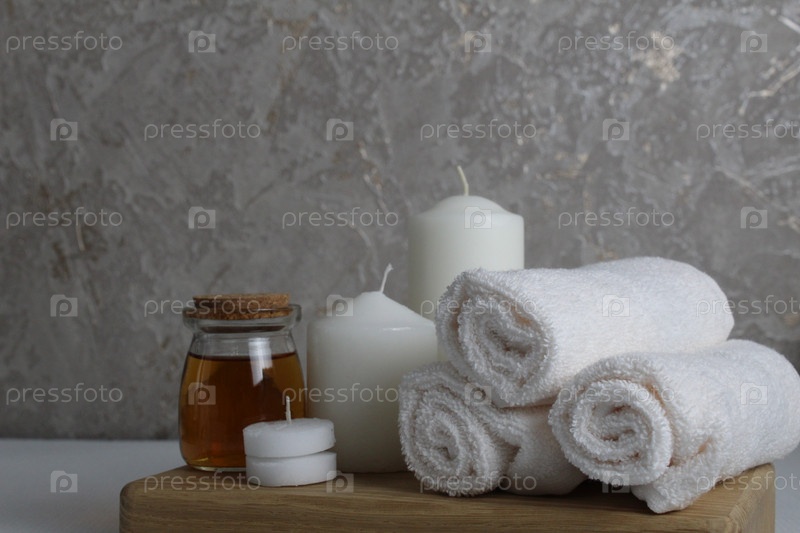 Спа расслабляющий массаж домашний уход за соевым телом. Масло для полотенец с белыми свечами в скрабе для бутылок в банке на белом сером фоне с пространством для текста. Косметический кабинет
