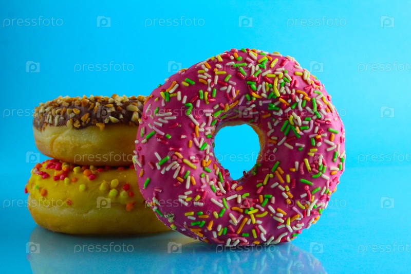 Натюрморт с поеданием сладких пончиков в розовой глазури с цветным разбрызгивателем стоит рядом со стопкой пончиков на синем ярком фоне с местом для текста картинки для стола