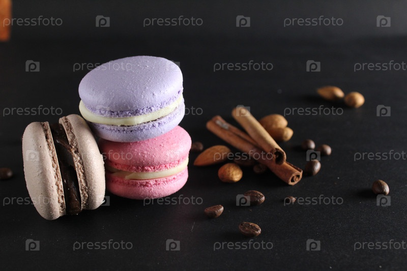 Миндальное печенье и палочки коричного миндаля лежат рядом с черным фоном с местом для текста и с копирайтом