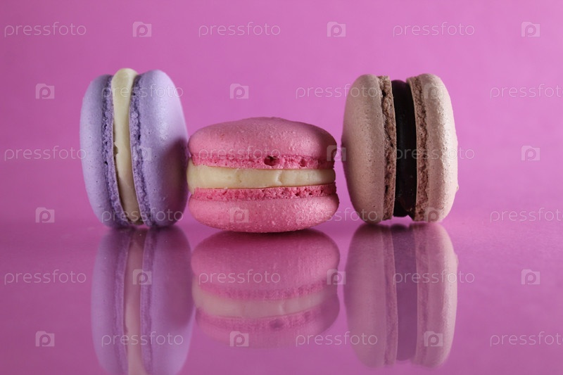 Три макаруна сиренево-коричневого шоколадно-лавандово-розового цвета лежат в ряд на розовом фоне цвета фуксии с отражением и местом для текста и копирайта