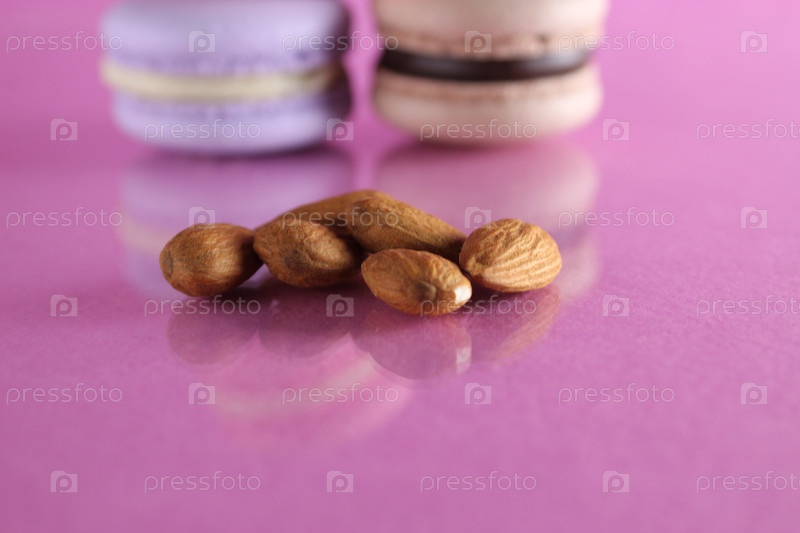 Приготовление миндальных печенье приводит к десерту Fratsuz и орехими миндалями на розовом фоне с местом для текста и кописпейса