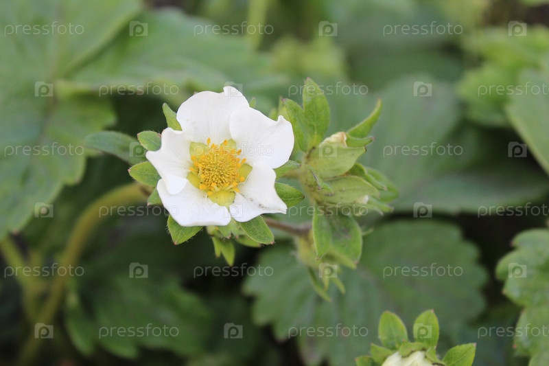 Кусты цветущей клубники с мелкими белыми цветками, весеннее плодоношение